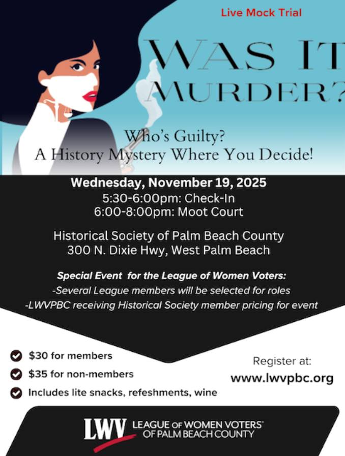 (West Palm Beach, FL – October 28, 2025) The League of Women Voters of Palm Beach County (LWVPBC)is inviting friends, supporters, and Law and Order fans of every political persuasion to a fascinating and fun event: